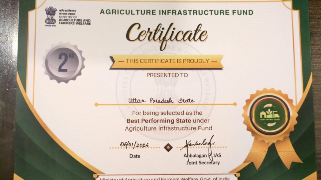 लखनऊ। कृषि अवसंरचना निधि (AIF) योजना के प्रभावी क्रियान्वयन में उत्कृष्ट प्रदर्शन के लिए उत्तर प्रदेश को ‘बेस्ट परफॉर्मिंग स्टेट’ का पुरस्कार प्रदान किया गया है। यह सम्मान कृषि एवं किसान कल्याण मंत्रालय की ओर से चंडीगढ़ में आयोजित एआईएफ रीजनल कॉन्फ्रेंस में दिया गया। समारोह में एआईएफ सेल की इंचार्ज एवं अपर जिला सहकारी अधिकारी अर्चना रॉय को ‘बेस्ट स्टेट गवर्नमेंट इम्प्लाई’ के पुरस्कार से भी सम्मानित किया गया।